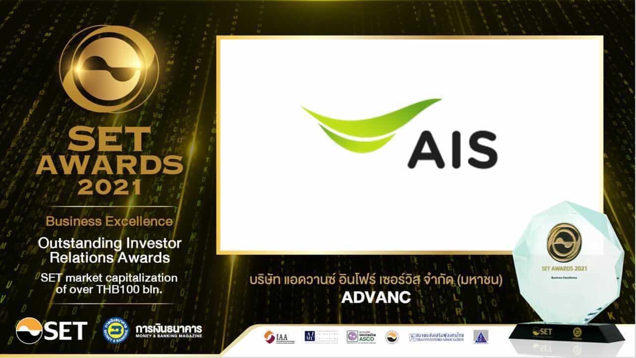 ส่งผลให้นำมาซึ่งความภาคภูมิใจอย่างยิ่งที่ปีนี้ AIS เป็นหนึ่งในองค์กรที่ได้รับรางวัลอันทรงเกียรติถึง 2 รางวัลจากเวที SET Award 2021 ที่จัดโดย ตลาดหลักทรัพย์แห่งประเทศไทย ในกลุ่มบริษัทจดทะเบียนที่มีมูลค่าหลักทรัพย์ตามราคาตลาดสูงกว่า 100,000 ล้านบาท โดยรางวัลแรก คือ Rising Star Sustainability Awards ที่เอไอเอสได้แสดงให้เห็นถึงความโดดเด่นในการดำเนินธุรกิจอย่างยั่งยืนในภาพรวม ที่นอกจากจะสร้างการเติบโตจากการบริหารจัดการอย่างมืออาชีพแล้ว ยังดำเนินงานโดยคำนึงถึงสิ่งแวดล้อม สังคม และบรรษัทภิบาล อย่างชัดเจน