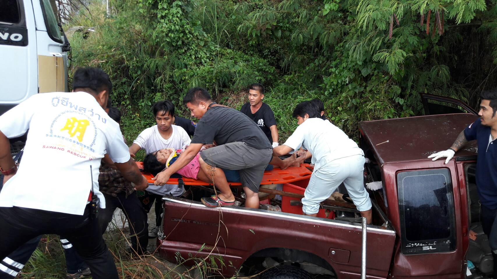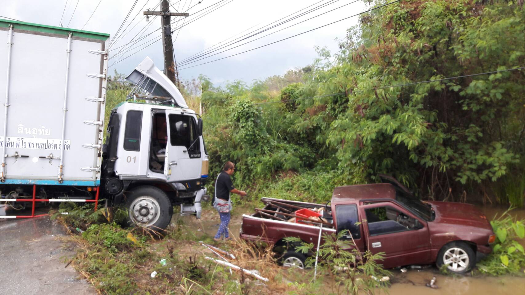 รถกระบะบรรทุกไก่ต้มน้ำปลาจะไปขายตลาดนัดขับตัดหน้ารถบรรทุกหกล้อช่วงฝนตกหนักถูกพุ่งชนท้ายตกคูน้ำริมถนนจนมีผู้บาดเจ็บ...