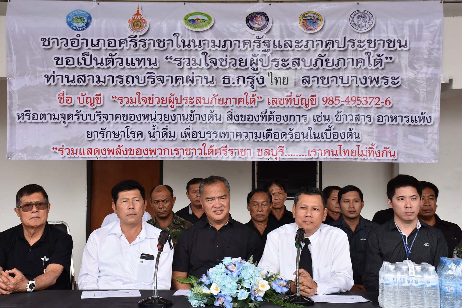 วันนี้(11 มกราคม 2560) ที่ อบต.บางพระ อ.ศรีราชา จ.ชลบุรี นายวรญาณ บุญณราช นายอำเภอศรีราชา นายสมศักดิ์ เกตุวัตถา นายก อบต.บางพระ ดร.สุริยา แสงพงค์ รองผู้อำนวยการองค์การสวนสัตว์ฯประธานชมรมชาวใต้อำเภอศรีราชา และหน่วยงานที่เกี่ยวข้องร่วมแถลงข่าวการตั้งจุดรับบริจาคสิ่งของบริโภค-อุปโภค และบริจาคเงินได้ที่บัญชี ชมรมชาวใต้ศรีราชา “รวมน้ำใจ ช่วยผู้ประสบภัยภาคใต้”...
