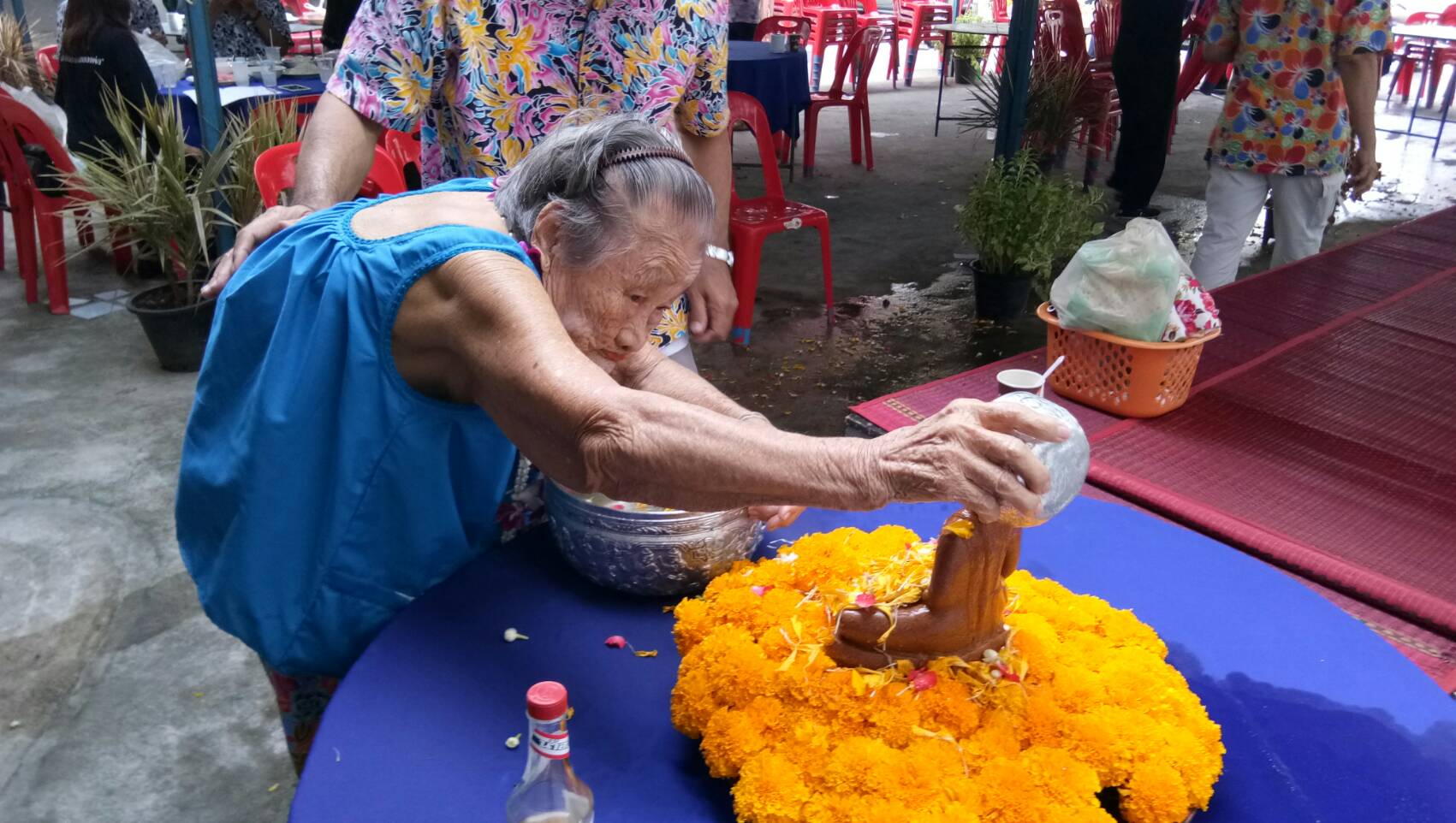 ที่ทำการชุมชนตลาดบน บางพระ นางนงเยาว์ กลิ่นสุคนธ์ ประธานชุมชนตลาดบน พร้อมคณะกรรมการชุมชน และชาวชุมชน ร่วมรดน้ำดำหัวขอพรจากผู้สูงอายุ ในชุมชนรวมถึงร่วมก่อพระเจดีย์ทราย เนื่องในเทศกาลสงกรานต์ ซึ่งชาวชุมชนตลาดบนได้ปฏิบัติเป็นพระเพณีมาอย่างยาวนาน ทั้งนี้เพื่อเป็นการให้ความสำคัญ ความรักและความเคารพต่อผู้สูงอายุ และได้รับพรที่เป็นมงคลจากผู้สูงอายุ รวมทั้งร่วมสืบสานวัฒนธรรมประเพณีอันดีงามให้ลูกหลานได้สืบทอดต่อไป โดยหลังเสร็จพิธีรดน้ำขอพร ชาวชุมชนก็ได้นำอาหารที่ได้ร่วมกันทำมา มารับประทานร่วมกันเพื่อแสดงถึงความรักความสามัคคีของคนในชุมชน