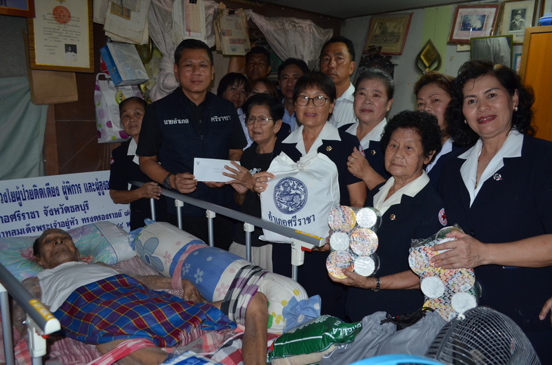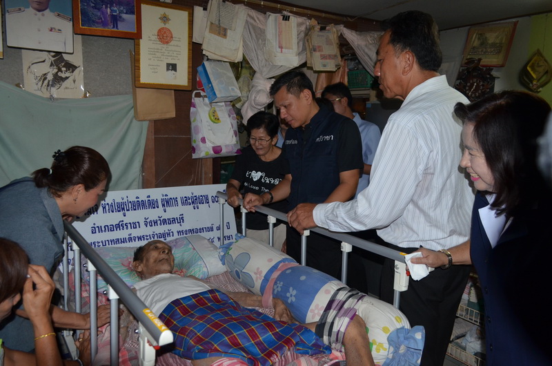 ที่ บ้านเลขที่ 74หมู่ 6 ตำบลบางพระ นายวรญาณ บุญณราช นายอำเภอศรีราชานายสมเจตน์ เกตุวัตถา นายกเทศมนตรีตำบลบางพระ สาธารณสุขอำเภอศรีราชา เจ้าหน้าที่จากโรงพยาบาลส่งเสริมสุขภาพตำบลบ้านห้วยกุ่ม อาสากาชาดศรีราชา กองสาธารณสุข กองสวัสดิการและสังคมเทศบาลตำบลบางพระ ได้ร่วมเดินทางเข้าเยี่ยมนายทอง ในพิมาย อายุ 79 ปี ซึ่งเป็นผู้ป่วยติดเตียงด้วยอาการเส้นเลือดในสมองแตก และบัตรประชาชนหมดอายุมาแล้ว 2 ปี ซึ่งในครั้งนี้นอกจากจะนำถุงยังชีพมามอบให้ เจ้าหน้าที่ยังให้บริการทำบัตรประชาชนให้อีกด้วย จากนั้นได้เดินทางไปที่บ้านนายลำพูน สุขสินธ์ อายุ 79 ปีที่เป็นผู้ป่วยติดเตียงด้วยอาการเส้นเลือดในสมองแตก มากว่า 10 ปี โดยได้นำถุงยังชีพแพม เพริส และเงินจำนวนหนึ่งมามอบให้ และเจ้าหน้าที่ได้ตรวจสุขภาพผู้ป่วย รวมถึงให้มีการจัดหาที่นอนลมให้กับผู้ป่วยตามที่ผู้ดูแลผู้ป่วยได้ร้องขอ ทั้งนี้เพื่อเสริมพลังใจให้กับผู้ป่วยและญาติ สร้างการมีส่วนร่วมจากทุกภาคส่วนในการดูแลประชาชน