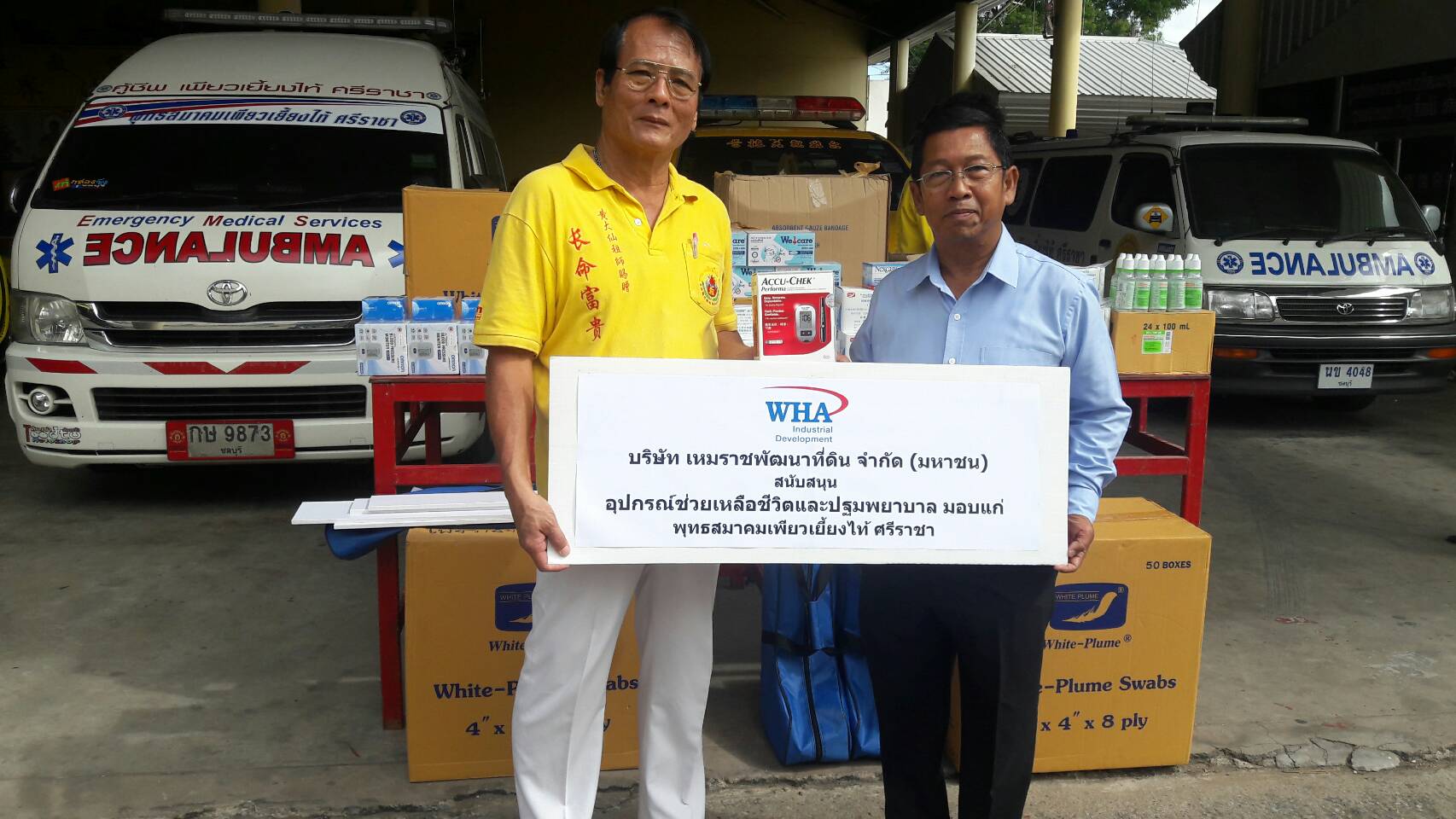 เมื่อเวลา 09.30 น. วันที่ 24 สิงหาคม 2560 ที่ หน้าศูนย์วิทยุพุทธสมาคมเพียวเยี้ยงไท้ ศรีราชา นายชัยวุฒิ กองมงคล ผู้จัดการฝ่ายเซฟตี้ นายสัญญา เบ้าพูนทอง ผู้จัดการชุมชนสัมพันธ์ บริษัทเหมราชพัฒนาที่ดิน จำกัด(มหาชน) ได้นำชุดปฐมพยาบาลและอุปกรณ์ทำแผลสำหรับช่วยเหลือผู้ที่ได้รับบาดเจ็บเบื้องต้น เช่น เครื่องวัดความดัน ถุงมือ ผ้าทำแผล (ผ้าก๊อซ) ขนาดต่างๆ ผ้ายืด น้ำยาล้างแผล แอลกอฮอล์ ยาฆ่าเชื้อ พร้อมไม้ดามดามกระดูก และอื่นๆอีกมูลค่ากว่า 50,000 บาท มามอบให้กับทางหน่วยกู้ภัยพุทธสมาคมเพียวเยี้ยงไท้ ศรีราชา โดยมีนายสมชาติ ชาติกิตติศาล ประธานหน่วยกู้ภัยเพียวเยี้ยงไท้ ศรีราชา พร้อมเจ้าหน้าที่และอาสาสมัครร่วมรับมอบอุปกรณ์ในครั้งนี้ เพื่อจะได้นำอุปกรณ์ทั้งหมดที่ได้มาไปประจำไว้ที่รถพยาบาลกู้ภัยและรถอาสาสมัครกู้ภัยเพื่อนำไปใช้ประโยชน์ในการช่วยเหลือผู้ประสบภัยในการปฏิบัติงานได้อย่างมีประสิทธิภาพตามวัตถุประสงค์ที่ทางบริษัทเหมราชพัฒนาที่ดิน จำกัด(มหาชน) มามอบให้มาในครั้งนี้