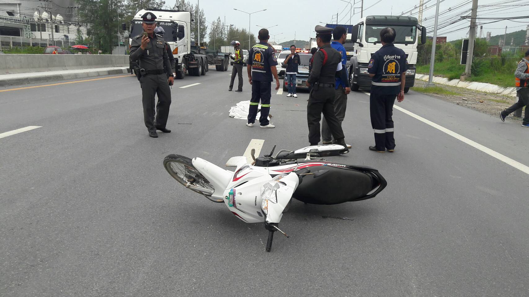 จากการสอบถามชาวบ้านในละแวกนั้น เล่าว่า ก่อนเกิดเหตุเห็นรถพ่วงวิ่งมาแต่ไม่ได้สนใจก่อนจะได้ยินเสียงเหมือนเหยียบอะไรจนมาทราบอีกทีก็มีรถจักรยานยนต์ล้มแล้วคนขับขี่ถูกเหยียบศรีษะเสียชีวิตด้วย เบื้องต้นคาดว่าผู้เสียชีวิตน่าจะออกกะหรือขับออกมาทำธุระช่วงพักแล้วขับมาตามเส้นทางก่อนจะถูกรถไม่ทราบชนิดตามมาเฉี่ยวแล้วล้มไถลไปห่อนจะถูกรถพ่วงที่ขับมาเหยียบซ้ำจนทำให้เสียชีวิตดังกล่าว ทางเจ้าหน้าที่จึงมอบศพให้หน่วยกู้ภัยส่งไปชันสูตรที่โรงพยาบาลแหลมฉบังเพื่อรอญาติและจะได้เร่งติดตามรถคันที่ก่อเหคุรายนี้มาดำเนินคดีต่อไป